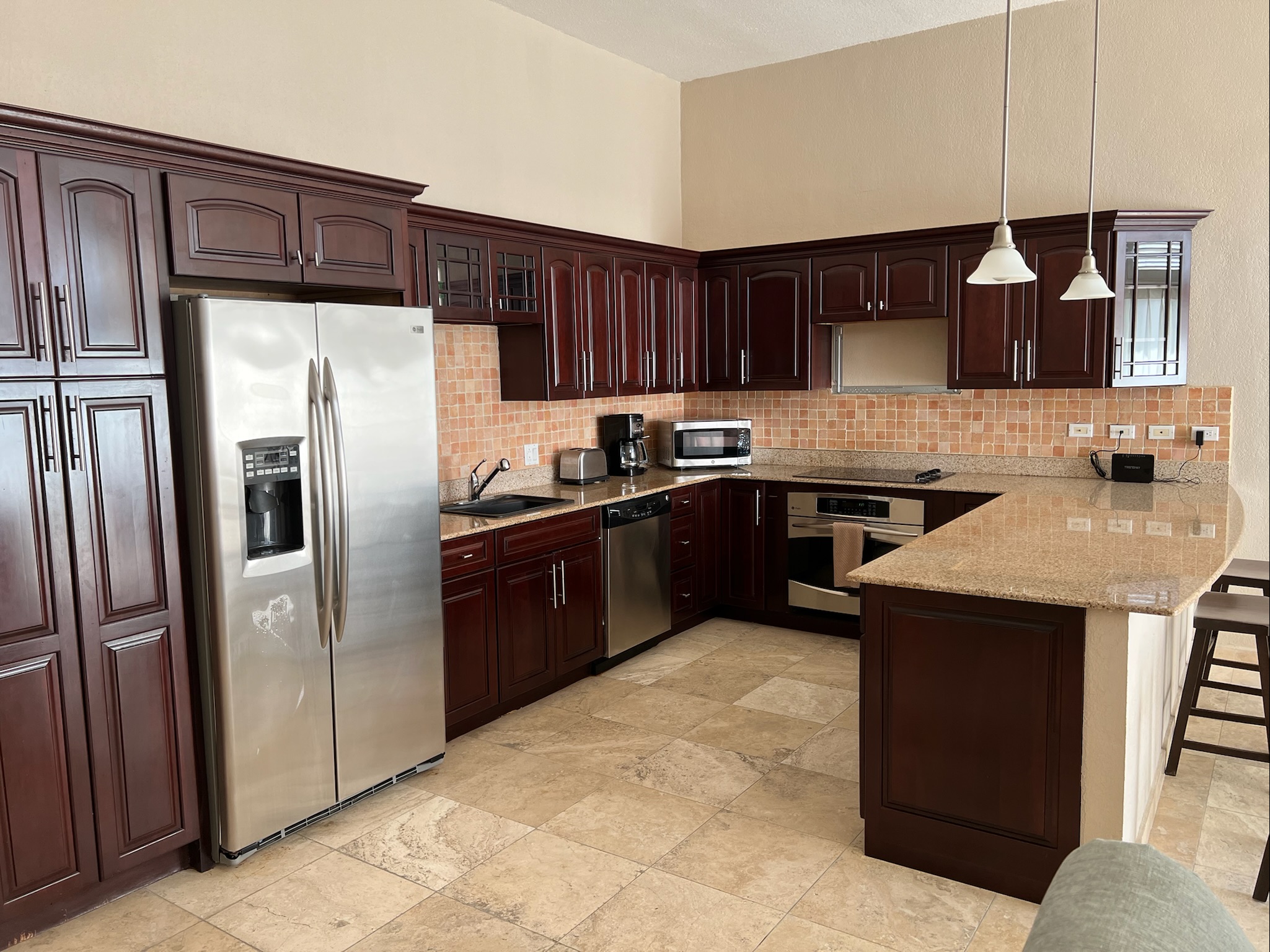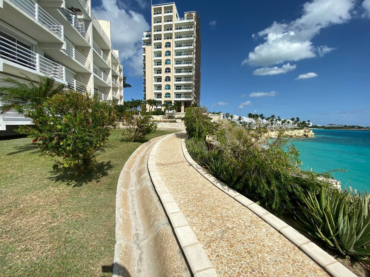 Welcome to your ultimate relaxation retreat! As you step inside this stunning apartment, you'll feel the tension of the outside world slowly fade away. Take a deep breath and soak up the serene atmosphere. In the living room, you'll be greeted by a plush couch and two comfy chairs, all positioned perfectly around a smart TV. You'll have access to the balcony where you can take in the breathtaking views while sipping a cup of coffee or reading your favorite book. The dining area is also nearby, so you can easily move from one space to another. The kitchen is a chef's dream, with everything you need to cook up a storm. From the blender to the toaster to the ninja coffee maker, you'll have all the tools you need to whip up your favorite dishes. There's even bar seating for three and a beautiful dining table to enjoy your meals. There are two cozy bedrooms, each with its own ensuite bathroom. The master bedroom boasts a luxurious king-sized bed with bedside lamps and plenty of closet space. You'll love the natural light that floods the room and the beautifully tiled shower in the bathroom. The guest bedroom features two plush queen beds and plenty of clothing storage, making it perfect for families or groups of friends. The ensuite bathroom in this room also has a stunningly tiled shower that can only be accessed through the bedroom. The Peloton bike provided will keep you fit during your stay, or take a leisurely stroll to your private patio, where you can enjoy a morning coffee or a glass of wine in the evening. For your convenience, there's a washer and dryer in the unit so you can pack light and always have fresh clothes. But that's not all - the real magic happens outside! Take a dip in one of the two oceanside pools, one with a wrap-around waterfall and the other with sun lounges, tables, and chairs. If you prefer a bit of shade, head to the third pool which is nestled under the building. Perfect for sun-sensitive skin or a refreshing dip in the cool water. But wait, it gets even better! Descend the beautiful spiral staircase and you'll find yourself at Cupecoy Beach. Take a stroll along the inviting shoreline, or venture into the secluded cave for a bit of adventure. Snorkeling, swimming, and sunbathing are all at your fingertips. This is not just a vacation spot, it's a place where you'll make lifelong memories. With the best sunsets on the island, you'll want to stay forever. So come, relax, and unwind - and start planning your next visit before you even leave. - Serene and relaxing atmosphere throughout the apartment. - Spacious living room with a plush couch and two chairs, smart TV, and access to the balcony. - Well-equipped kitchen with all the necessary tools to cook your favorite meals, including a blender, toaster, and ninja coffee maker. - Bar seating for three and a beautiful dining table to enjoy your meals. - Two cozy bedrooms, each with a en suite bathrooms, including the master bedroom with a luxurious king-sized bed and ample closet space. - Washer and dryer in the unit for your convenience. - Three beautiful pools, including two oceanside pools with spectacular views and a third pool nestled under the building for sun-sensitive skin. - A stunning spiral staircase leading down to Cupecoy Beach, where you can enjoy swimming, snorkeling, or taking a sunset beach walk. - Secluded cave at the beach for a bit of adventure.